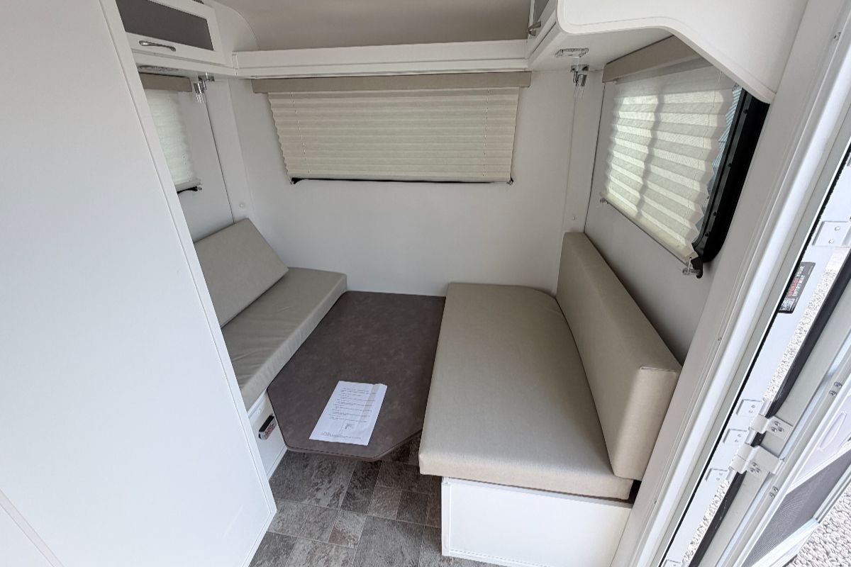 ESCAPE 19 F1: Mid-size open layout with a front dinette for four and a permanent rear bed for two. 19'6" long, 3,150 lbs dry. Options include compressor fridge and composting toilet. Sleeps up to five with optional cot.