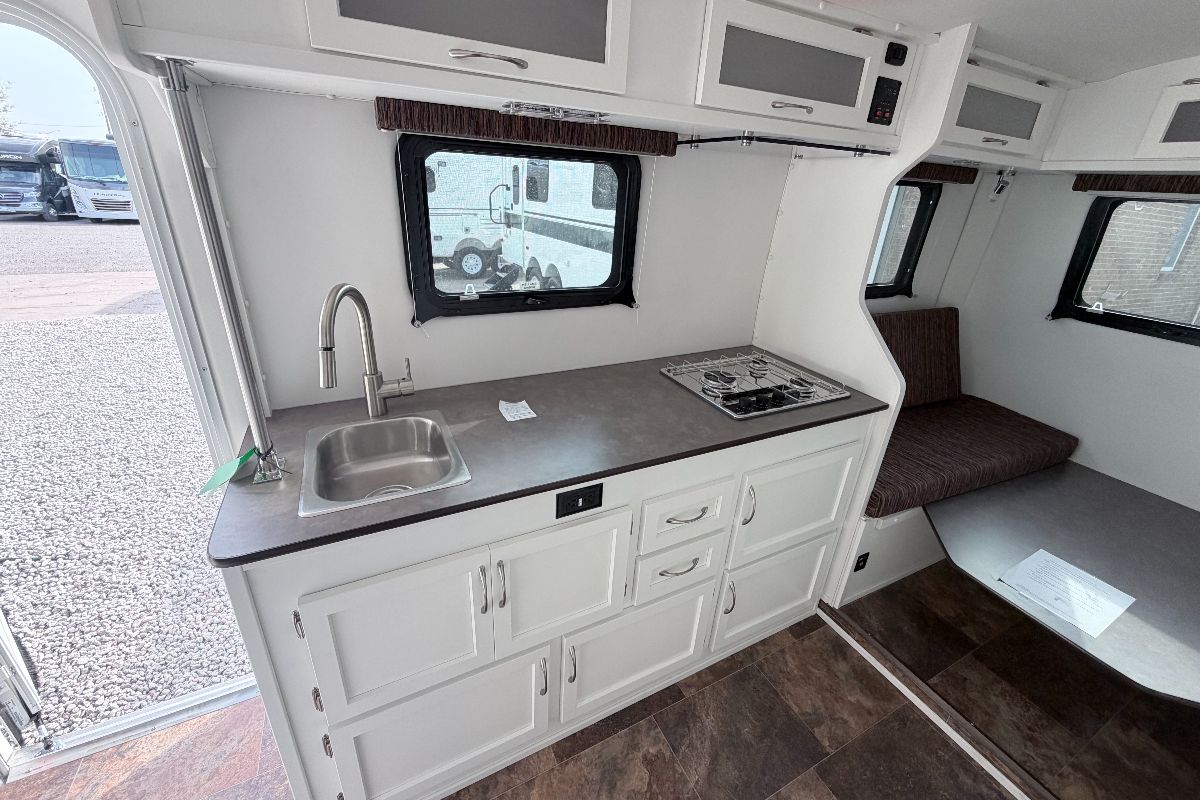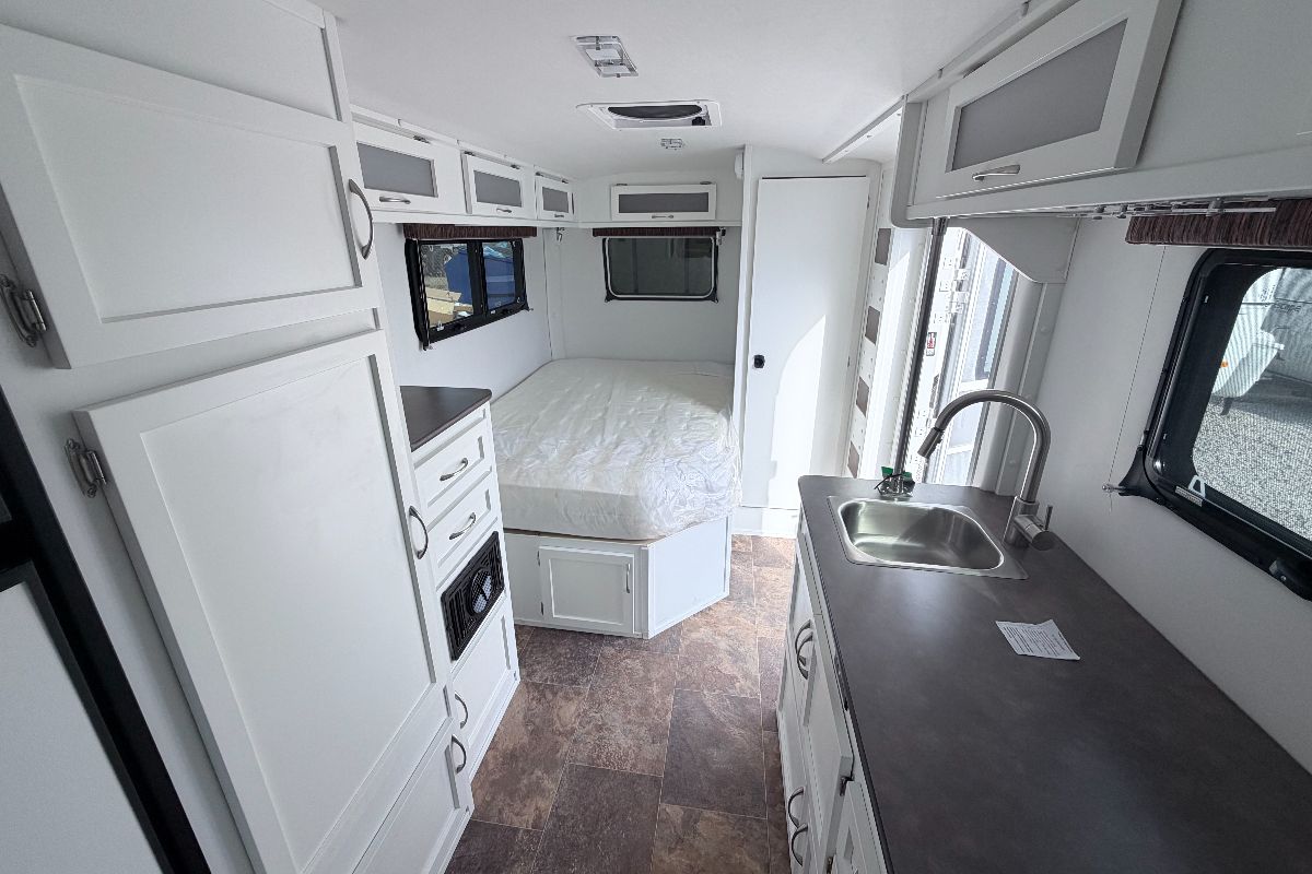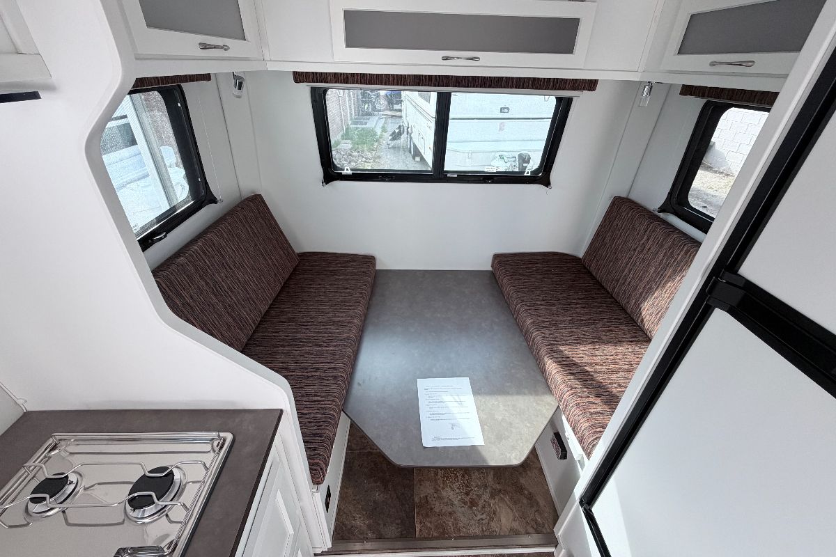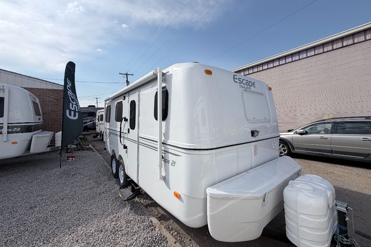 ESCAPE 21C: Classic front-bedroom layout with a permanent north/south bed and a four-person rear dinette. Easy in-and-out from both sides of the bed. The most traditional RV layout in the Escape lineup. Popular with full-timers.