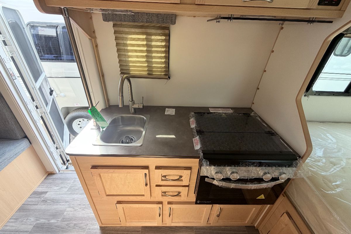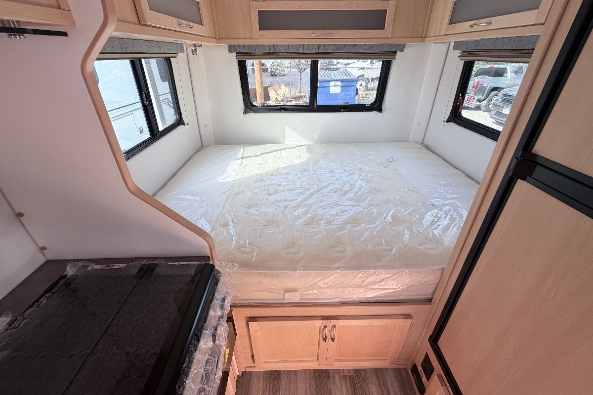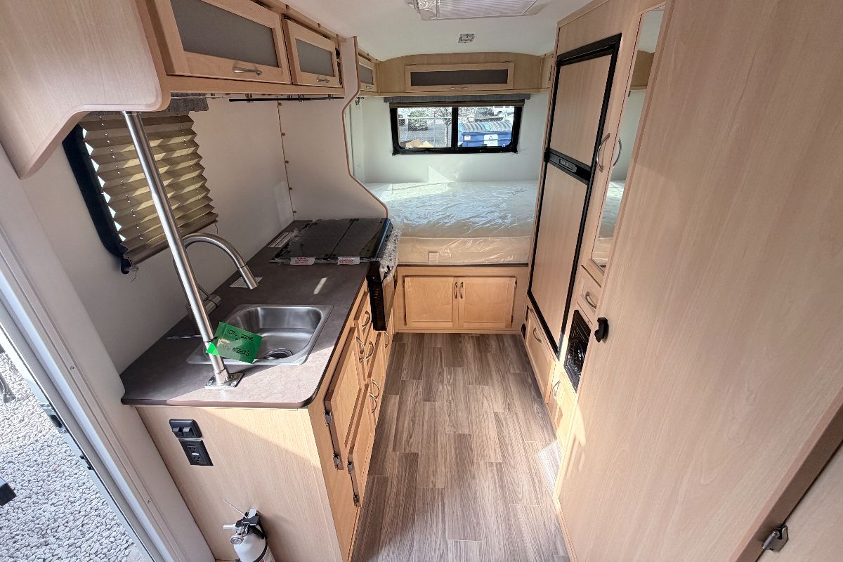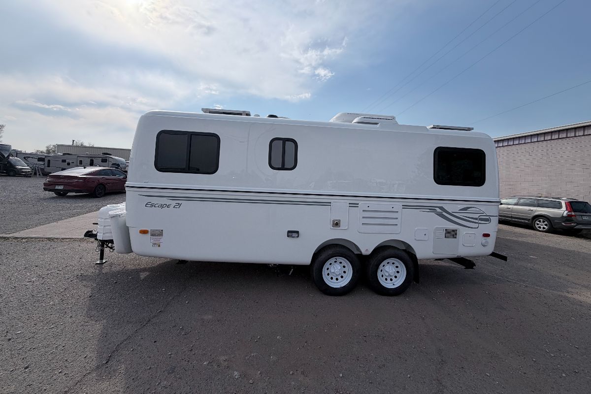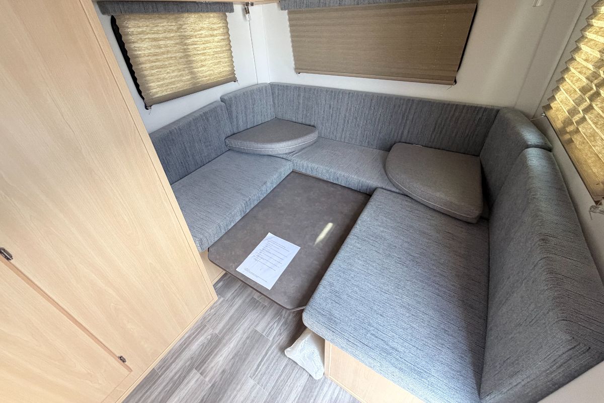 ESCAPE 21NE F1: Open concept with a massive six-person U-shaped front dinette and a permanent rear bed for two with curtain divider. The largest seating area in the entire Escape range. Built for families who host.