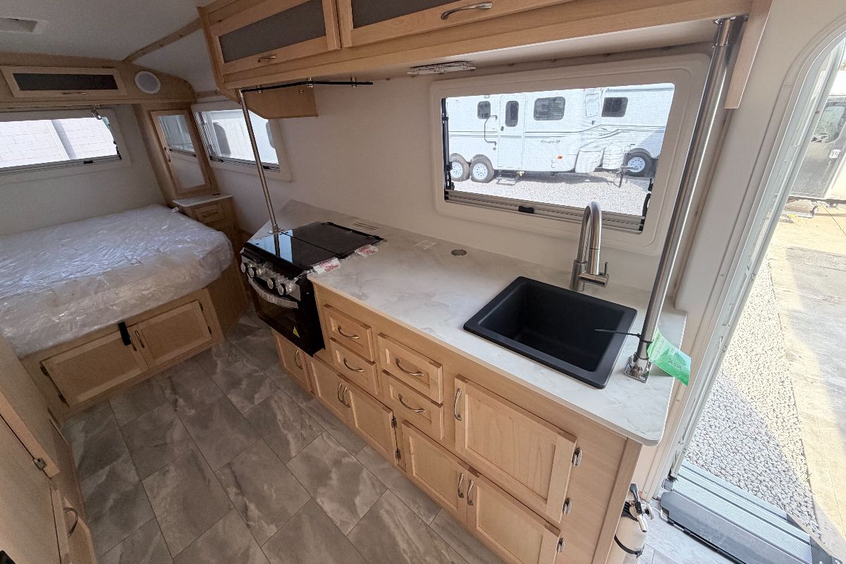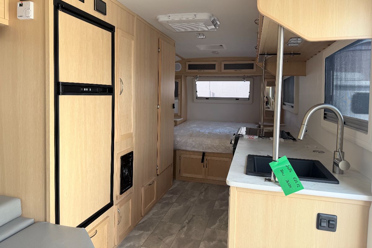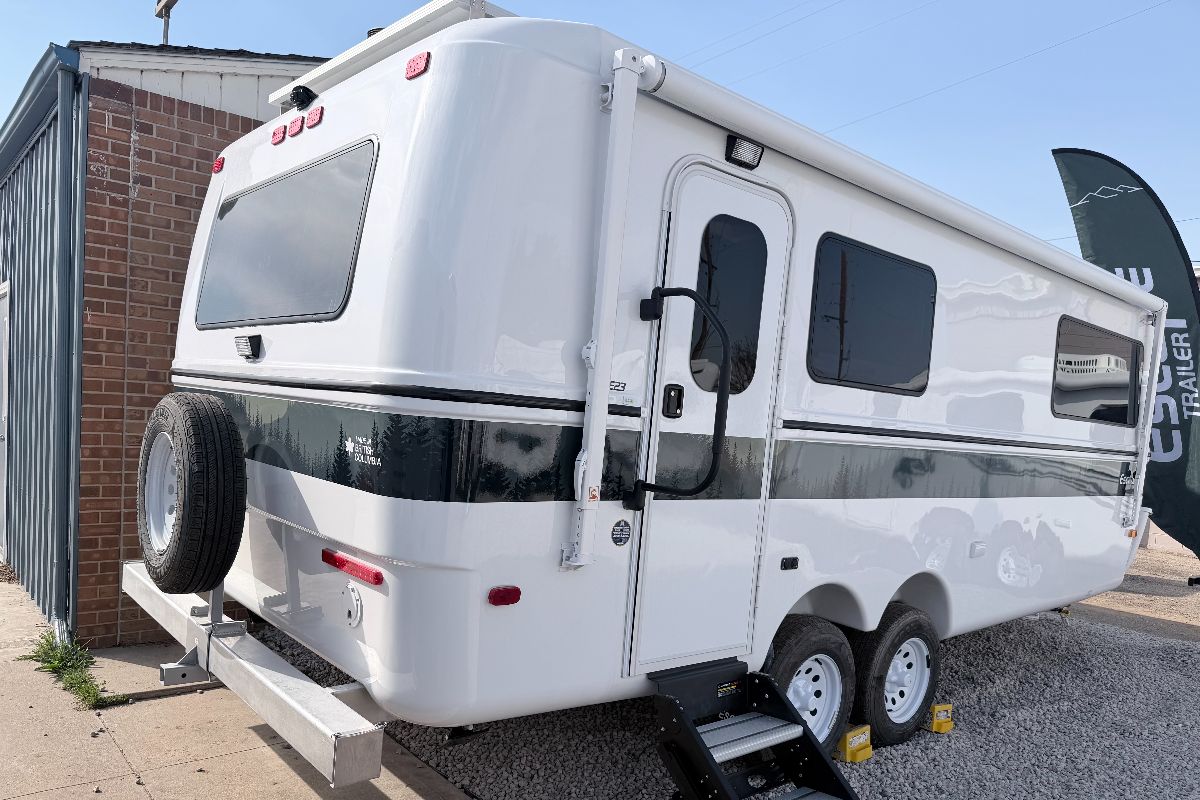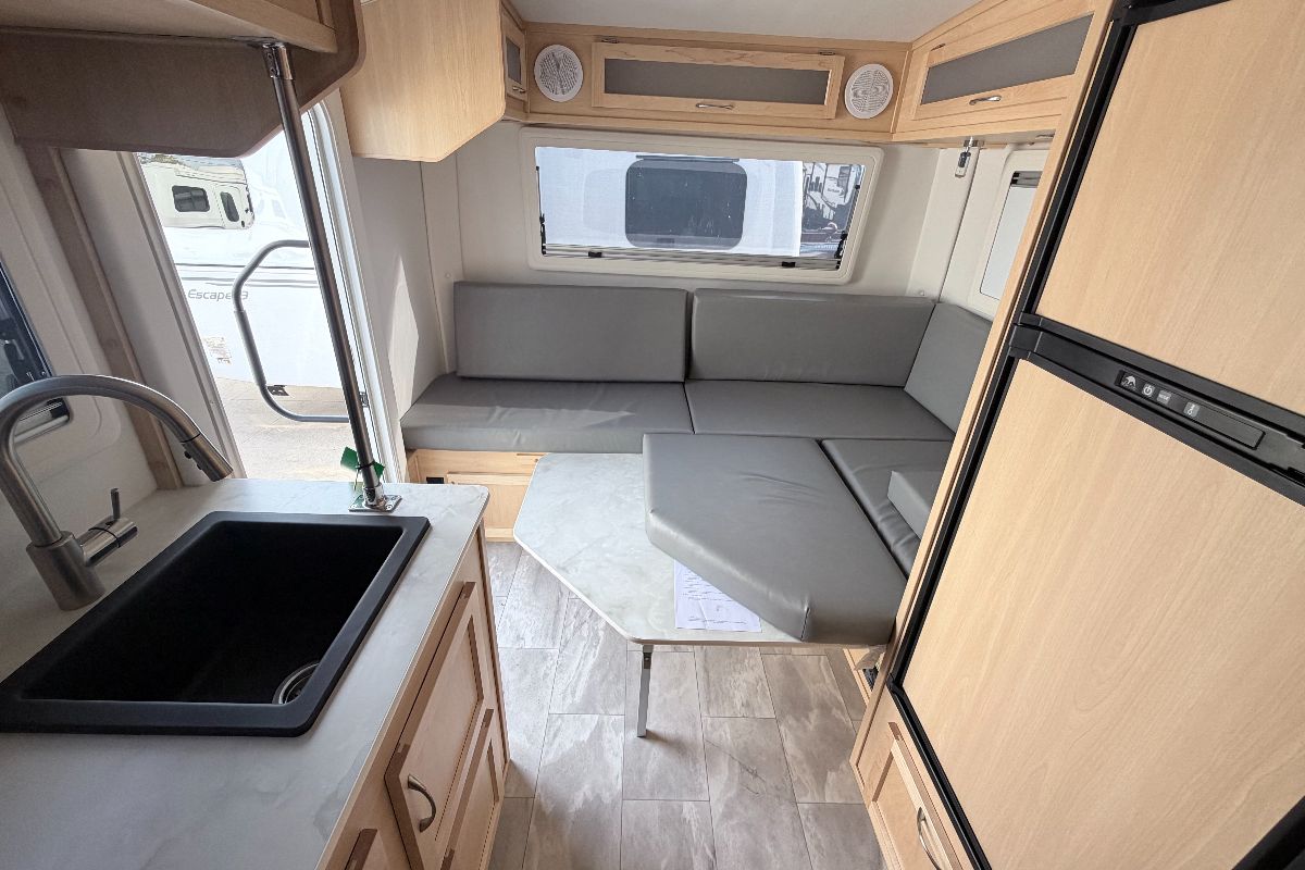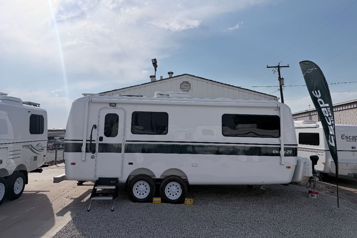 ESCAPE 23 F1: Flagship model with a walk-around queen bed up front and an L-shaped rear dinette. 24'7" exterior, 6'5" ceiling. Rear entry door. Supports up to 4 solar panels and 4 lithium batteries for off-grid living.